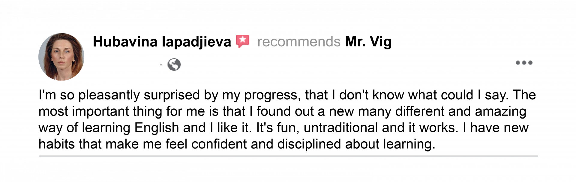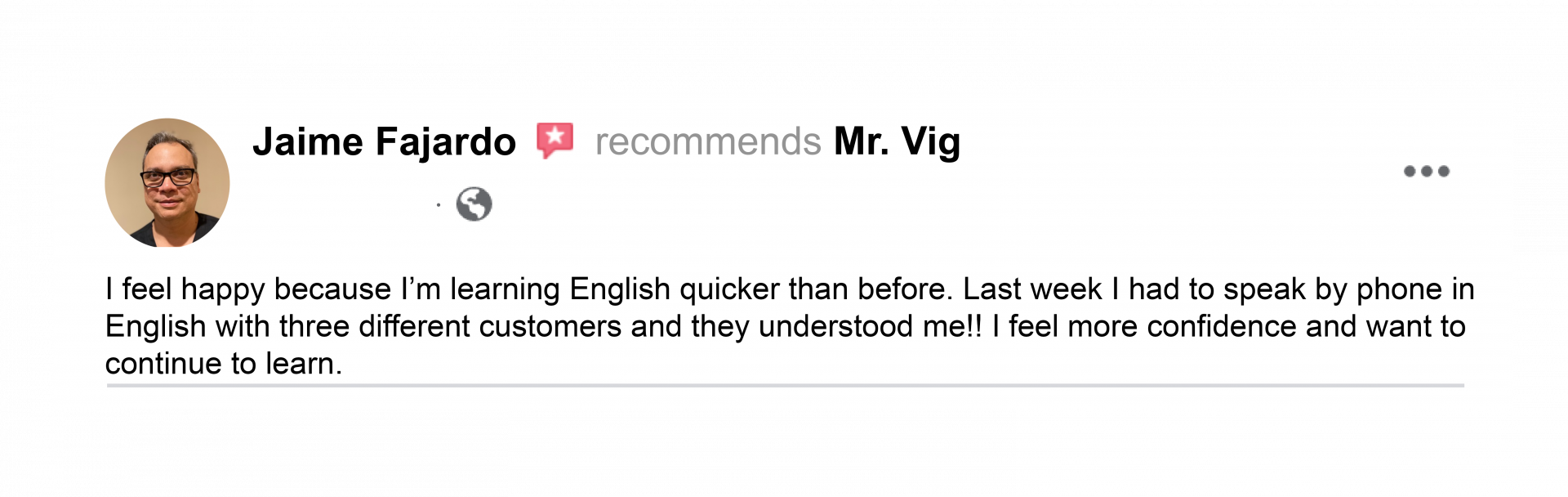 Dear Mr. Vig, after 30 days of religiously following your methods, I have this awesome transformation in speaking. Now I'm having fun with it.