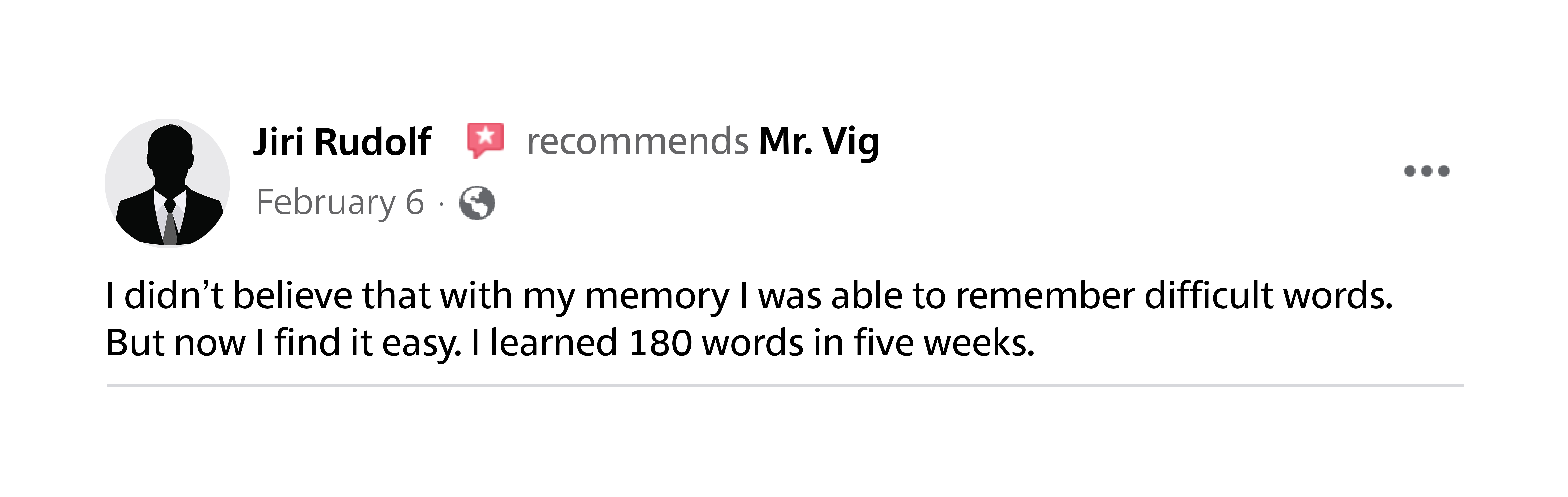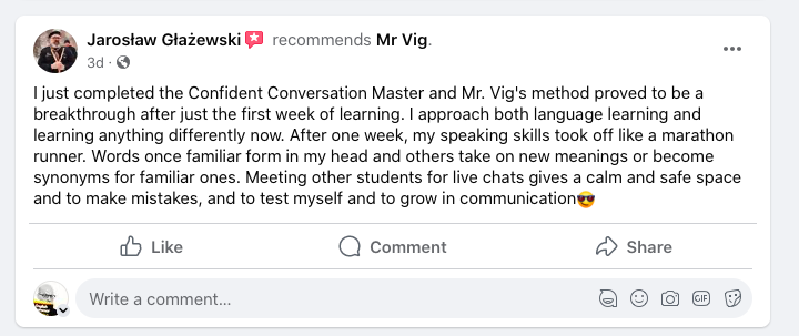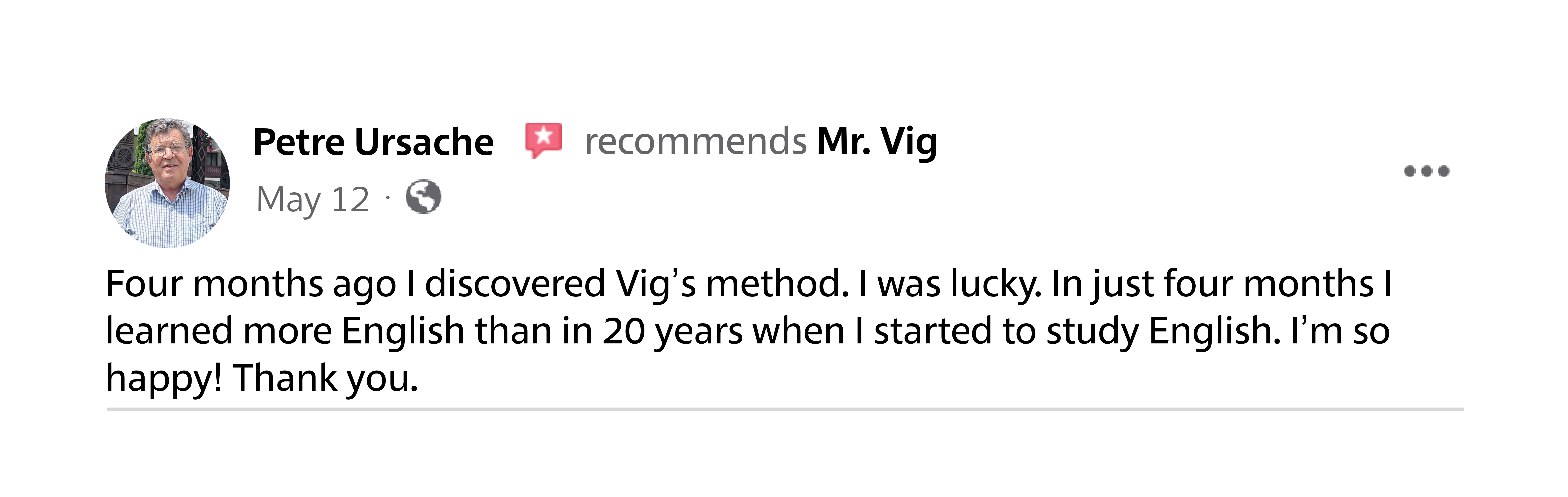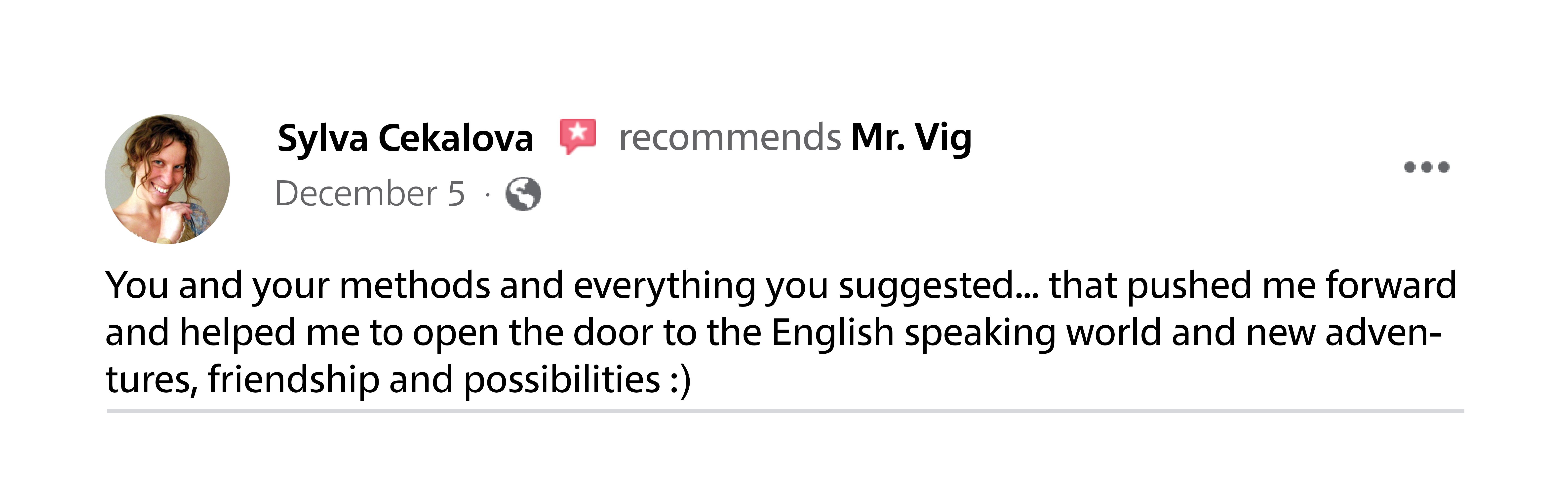 Although I spent lots of time and money on language courses in the past, including the British Council, I still wasn’t confident. Now, thanks to Mr. Vig’s unique approach, I’m not nervous when I speak and I’m starting a new career where I’ll need a high level of English.